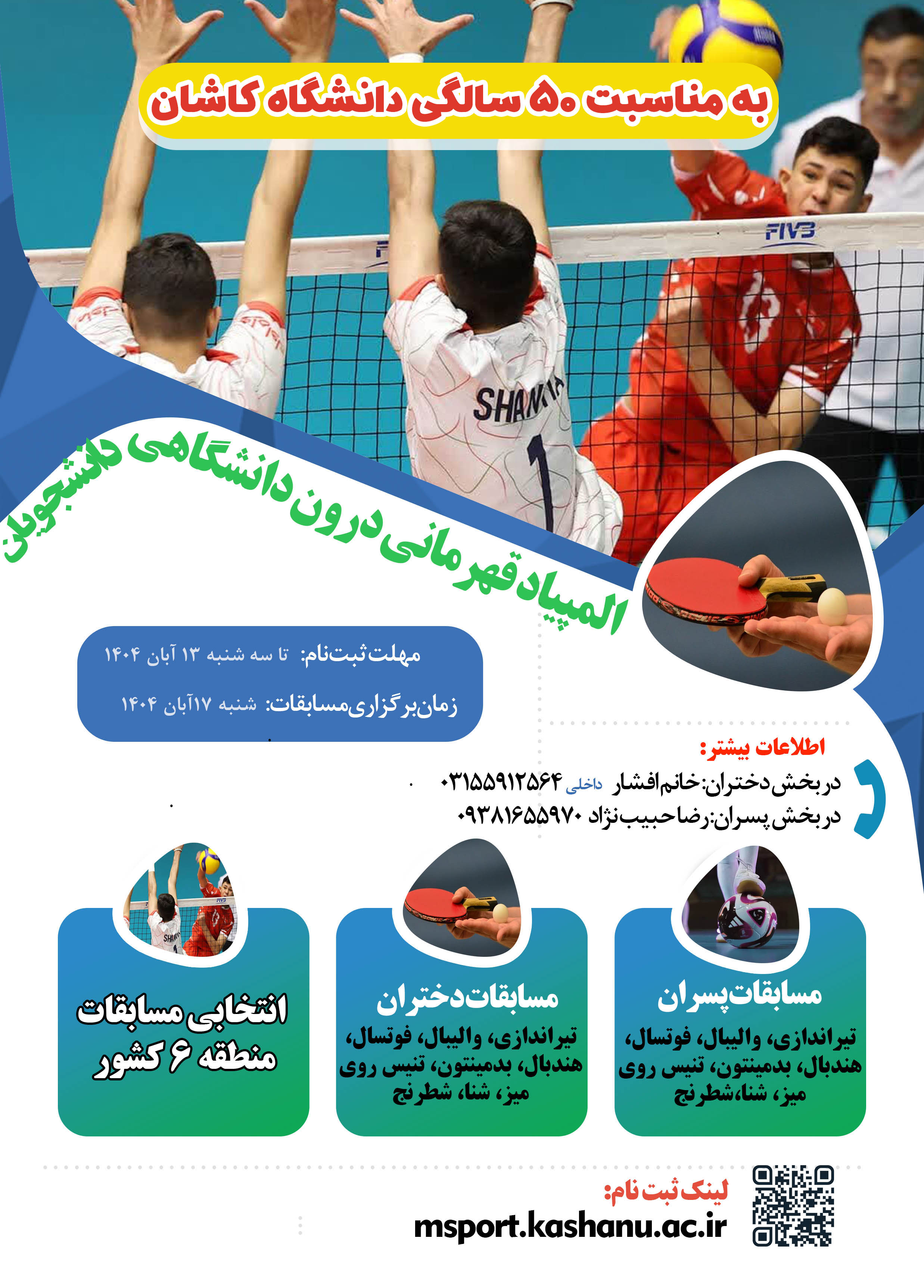ثبت نام المپیاد درون دانشگاهی ورزش های قهرمانی ویژه دانشجویان ۰۵ آبان ۱۴۰۴ | ۱۶:۱۳ اطلاعیه ها تعداد بازدید:۳۷۹ در صورتی که مایل به شرکت در چند مسابقه تیمی می باشید فرم را مجدد تکمیل نمایید لینک ثبت نام ورزش های تیمی: کلیک کنید لینک ثبت نام ورزش های انفرادی: کلیک کنید