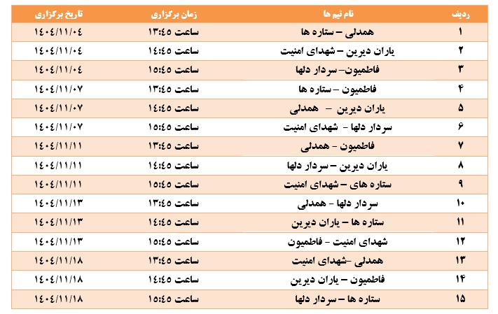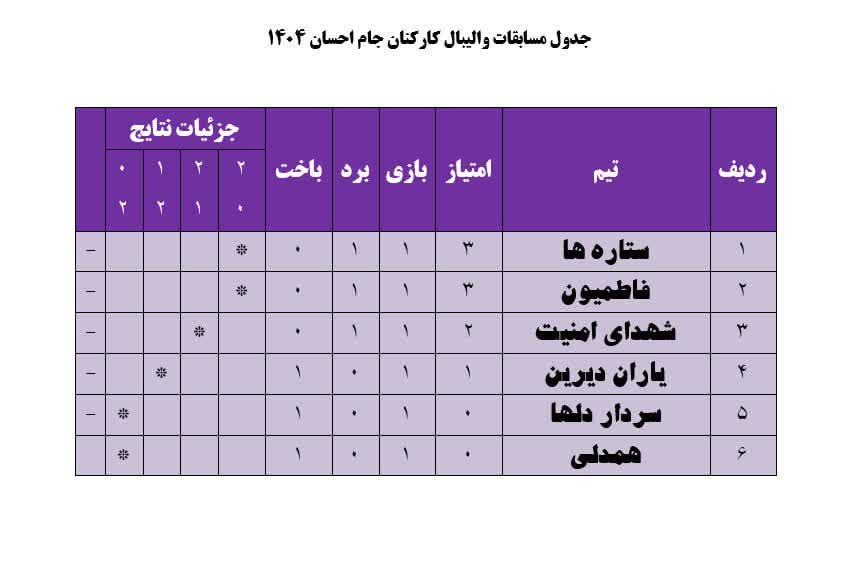 - 3-در صورت تساوی امتیاز و تعداد بردها، تعداد گیم های برده تقسیم بر گیم های باخته جایگاه تیم را مشخص می کند.